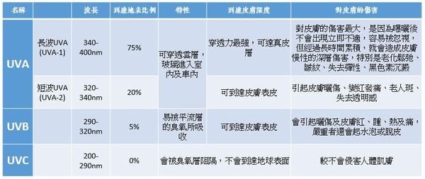 紫外線(Ultraviolet或簡稱UV)是直間接造成或加重各式皮膚疾病的重要元凶。根據波長的不同,到達皮膚的深度跟對皮膚的傷害又有所不同 (表一)。